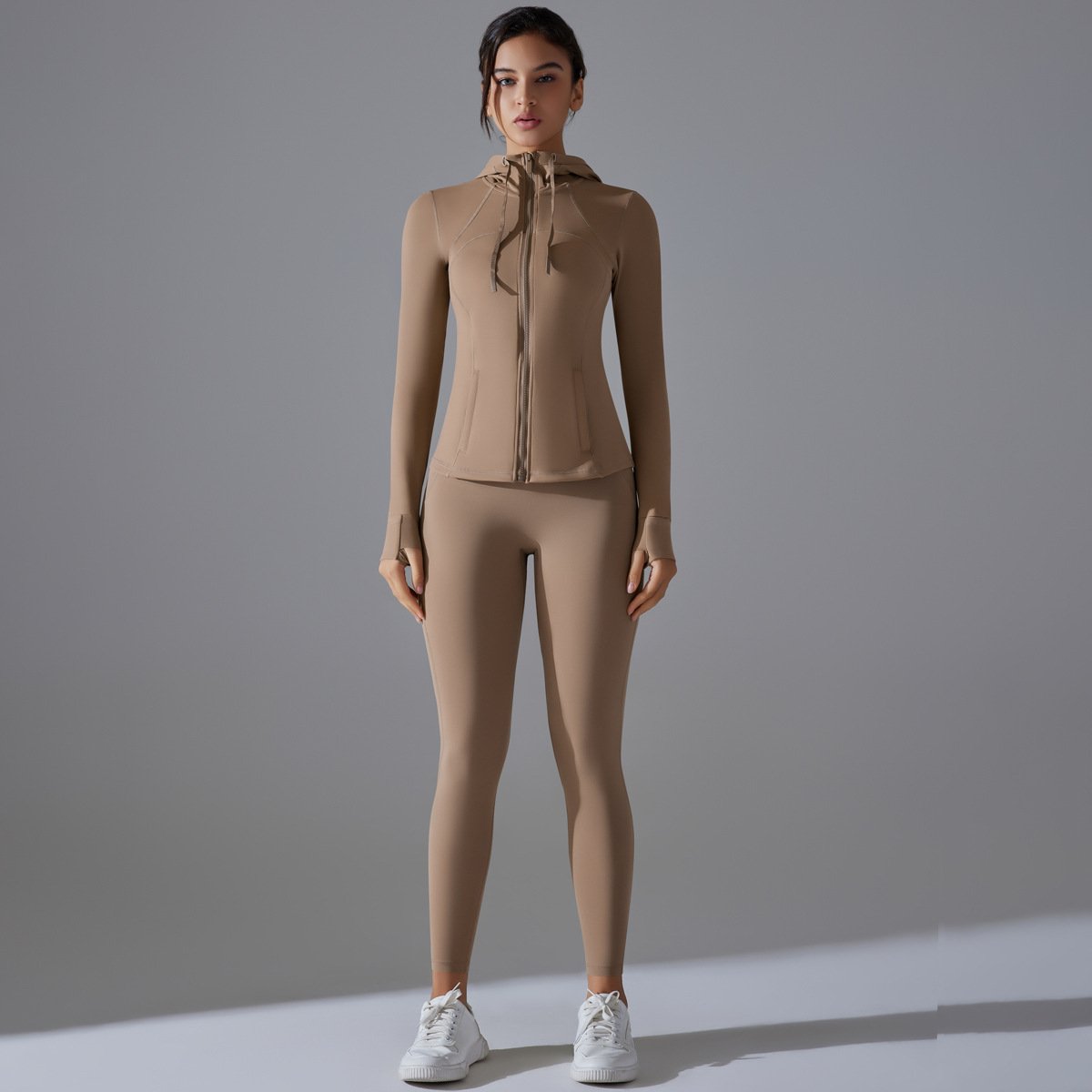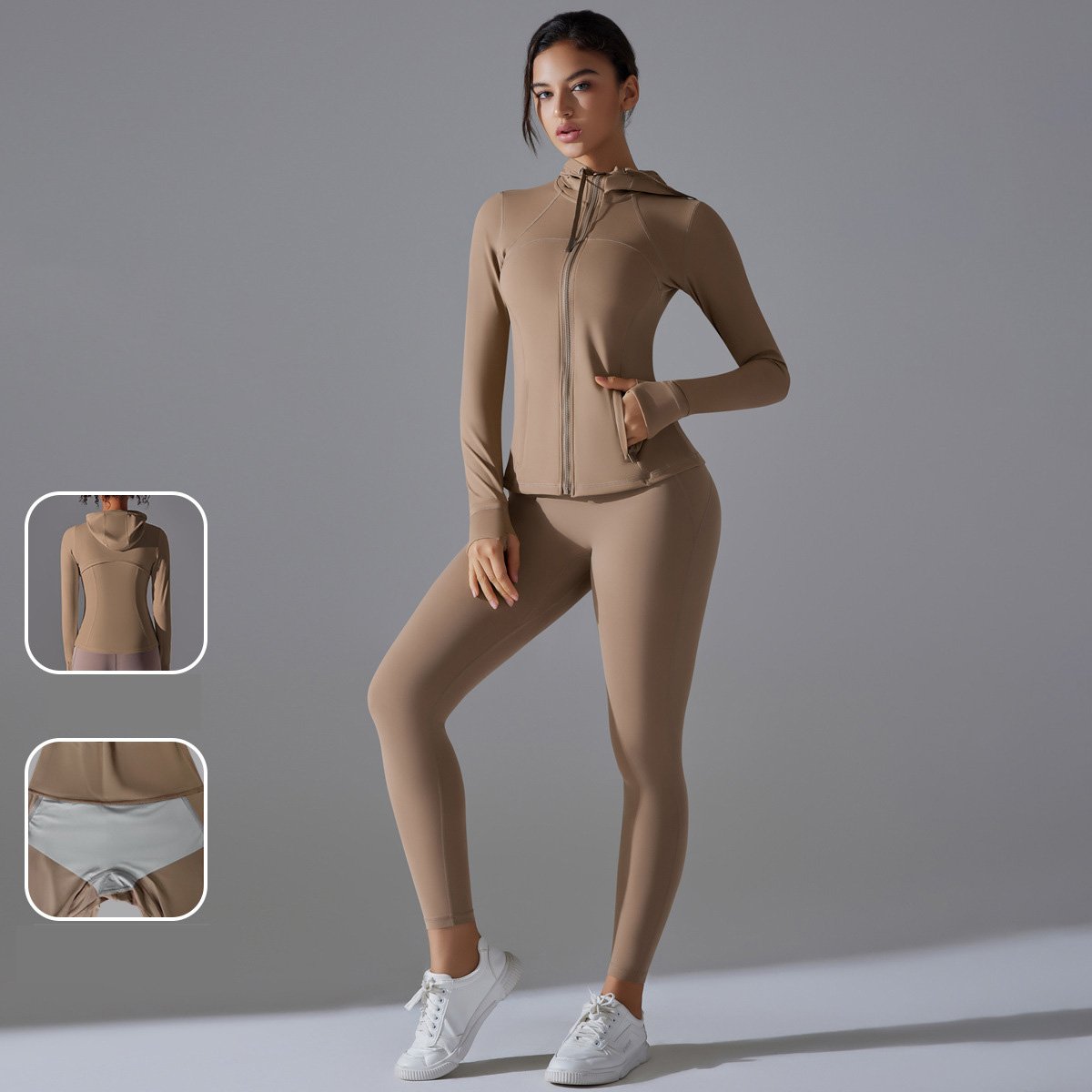 Double-sided Brocade Yoga Set with Solid Color, Zipper and Hooded Sports Coat for Running and Fitness